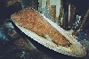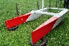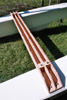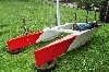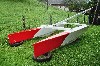 Une fois les coques, les poutres, le mât, les safrans et la barre (réalisée à l'aide de deux épaisseurs de CP 10 mm contrecollées pour lui donner sa courbure), j'allais pouvoir passer à la peinture, en suivant l'ordre habituel : 1 couche de primaire époxy puis 2 couches de laque de finition polyuréthane, blanche et orange. Pourquoi orange ? Parce qu'il n'y avait plus de rouge en stock le jour de l'achat de la peinture !!!
