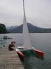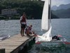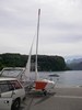 La remorque descend sur la cale (pas de photos, j'étais un peu occupé à ce moment là !!), et peu à peu, c'est l'eau qui supporte le poids de Dingo (car il a été baptisé, ça porte malheur sinon !), jusqu'à ce qu'il se libère complètement et vienne se ranger près du ponton ... Pas le temps de m'émouvoir, il faut aller garer la voiture et la remorque avant de partir sur le lac, laissant Dingo entre de bonnes mains (c'est ma copine Claire sur les photos ci-dessous) ...