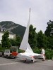 Il a donc fallu terminer la fixation des sangles sur les voiles et le trampoline (j'ai finalement décidé de coudre des sangles plutôt que de mettre des yeux rivetés, pour être tranquille sur la solidité surtout en ce qui concerne le trampoline ...), fixer la gorge du mât (3 tubes en alu de 1.8m chacun), et encore fabriquer des patins de mise à l'eau à fixer sous les ailerons, qui finalement ne serviront pas ... Bref, plein de petites choses pas bien méchantes mais qui prennent tout de même un minimum de temps ... pour enfin aboutir au premier montage du bateau sur sa remorque, voiles hissées :