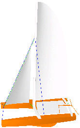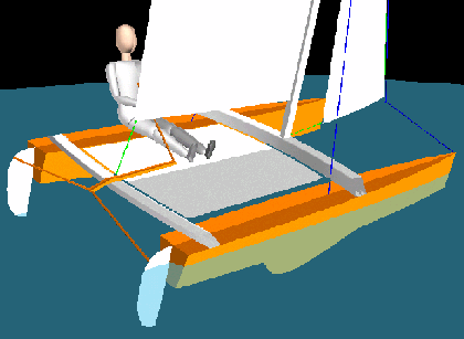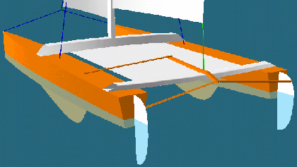 Je l'ai dessiné avant tout dans un souci d'économie et de simplicité, pour avoir un petit bateau de balade transportable pour la bronzette et la sieste sur le lac d'Annecy. En effet, son poids l'empêchera certainement d'accéder à de grandes performances (si j'arrive à lever un flotteur comme sur l'image ci-dessous ce sera déjà formidable !) ... Mais ça ne fait rien, j'aurai en naviguant dessus la fierté de l'avoir entièrement conçu et construit ! Côté budget, je devrais m'en tirer à moins de 1500 ?, en fabriquant moi-même les voiles, le mât, quelques pièces d'accastillage, et tout ce qui est peut être réalisé par un amateur.